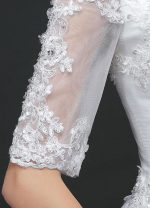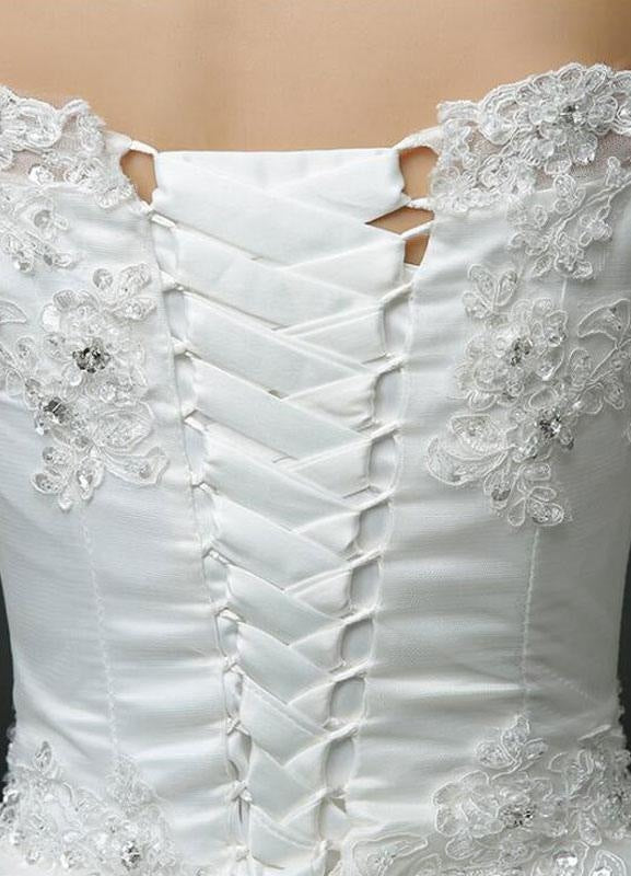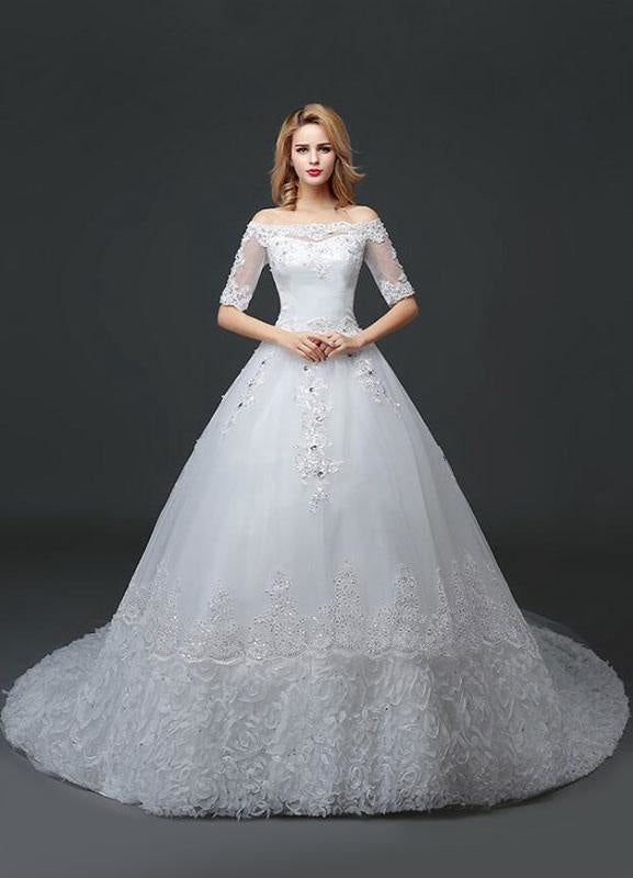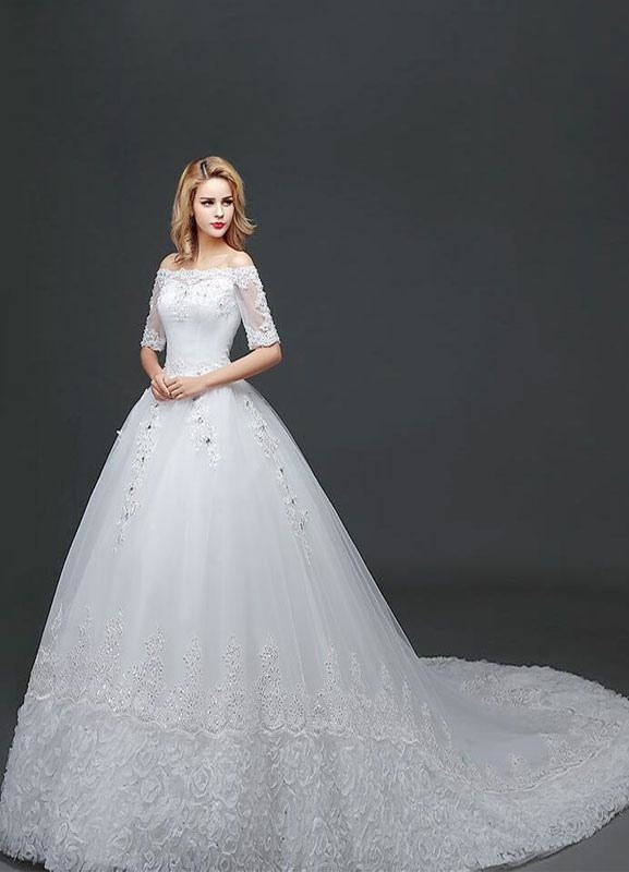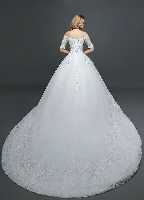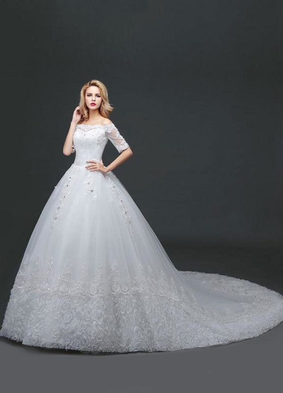 White Half Sleeve Ball Gown Princess Wedding Dress with Off The Shoulder Lace Beading and Cathedral Train