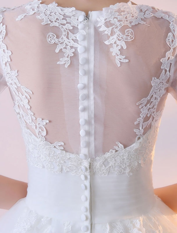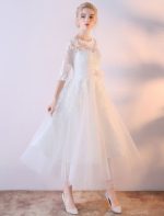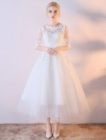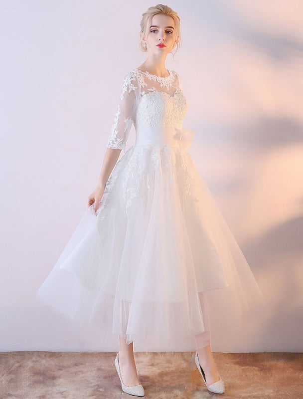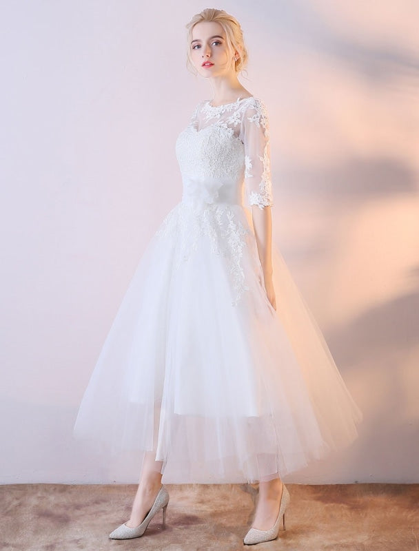 White Half Sleeve Lace Applique Tea Length Bridal Dress Short Wedding Dresses
